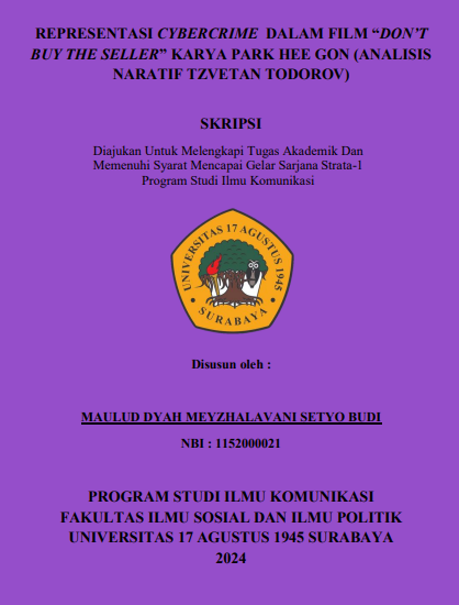 Perkembangan teknologi hingga internet yang semakin modern memungkinkan banyak orang yang melakukan kejahatan secara online salah satunya kejahatan penipuan online. Cybercrime merupakan kejahatan dunia maya dengan memanfaatkan media komputer dan jaringan internet yang menjadi tantangan pada zaman sekarang ini. Dalam film “Don’t Buy The Seller” yang bergenre thriller disutradarai oleh Park Hee Gon pada tahun 2023 ini menceritakan seorang wanita mengalami penipuan online barang bekas yang rumit dan berujung pada kejahatan cyber. Berdasarkan latar belakang tersebut terdapat dua rumusan masalah yang dapat diteliti pada penelitian ini yaitu Bagaimana alur cerita film “Don’t Buy The Seller” menurut analisis Tzvetan Todorov?, dan Bagaimana representasi Cybercrime yang ada pada film “Don’t Buy The Seller?”. Penelitian ini menggunakan penelitian kualitatif yang menggunakan metode analisis naratif model Tzvetan Todorov dengan membagi alur menjadi 3 bagian yaitu Alur awal, Alur tengah, dan Alur Akhir. Pada hasil penelitian ini peneliti menganalisis terdapat tindakan cybercrime berupa peretasan (Hacking) dan Penguntitan dunia maya (Cyber Stalking) pada alur cerita film “Don’t Buy The Seller”. Setelah peneliti membagi menjadi tiga alur pada alur awal cerita dimulai pada scene 1 hingga scene 4 yang mana alur awal tersebut terdapat tindakan cyber kepada Soo Hyun berupa penipuan online, peretasan (Hacking) dan pencurian identitas. Pada alur tengah terdapat pada scene 5 sampai scene 11 yang menjelaskan berbagai macam gangguan serta konflik yang dialami oleh Soo Hyun seperti pemerasan (Extortion) dan penyebaran informasi (Doxing) oleh penipu ke situs penjualan online. Sedangkan pada alur akhir cerita terdapat pada scene 12 sampai 13 terjadi keseimbangan baru memperlihatkan Soo Hyun menjalani kehidupan barunya sebagai ketua pimpinan tim interior setelah melewati berbagai macam gangguan dan teror dari penipu.